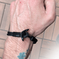 Deze Adventus herenarmband is gemaakt van een slijt- en kleurvast polyester koord en een zwart anker van geplateerde legering. De armband is eenvoudig om je pols te bevestigen door het anker door de lus te steken.