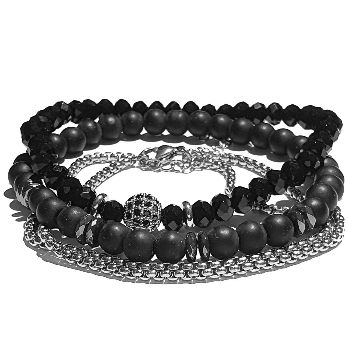 Deze unieke set bestaat uit twee kralen armbanden combineert met een mooie dunne subtiele stalen schakelarmband. De stalen schakelarmband bestaat uit twee 2mm armbanden die samen uitkomen op één sluiting.